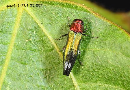 ↑瘦吉丁蟲 (吉丁蟲科)體長9mm,體型瘦長,體色綠色或灰綠色具金屬光澤,頭部短但寬長與胸略同,前胸背板具橙色金屬光澤,小楯板黑色,翅鞘灰綠色密部黃、綠光澤小斑,近翅端內外側緣顏色較深,觸角及各腳金綠色。本種分布於低中海拔山區,白天於葛藤葉面活動,少數個體夜晚會趨光,棲息量少。