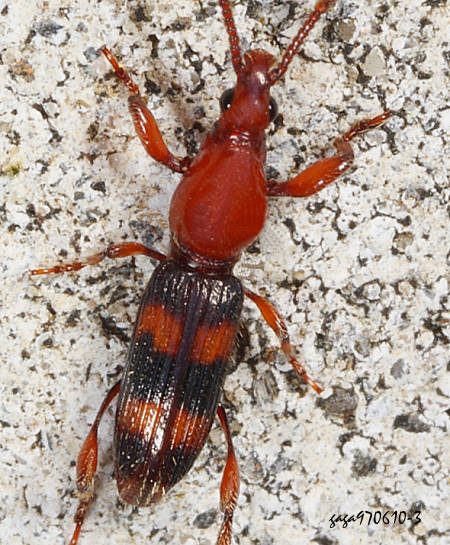 ↑三錐象鼻蟲(雄) Mesoderes latecotatus (三錐象鼻蟲科)體長6.2mm,頭胸及觸角紅色,雄蟲口吻短,前胸背板具光澤,前後端部窄,中央寬且隆起呈球狀,翅鞘黑色具突起的縱向稜線,翅面有2條紅褐色的短斑但合翅時不相連,各腳紅褐色,後腳較長,腿節末端膨大。本種體型甚小,斑紋橫向,與黃紋三錐象鼻蟲斑型不同,僅2列橙褐色斑,不具黃斑,分布於中海拔山區,局部地區出現,稀少。(學名提供:熊盛志)