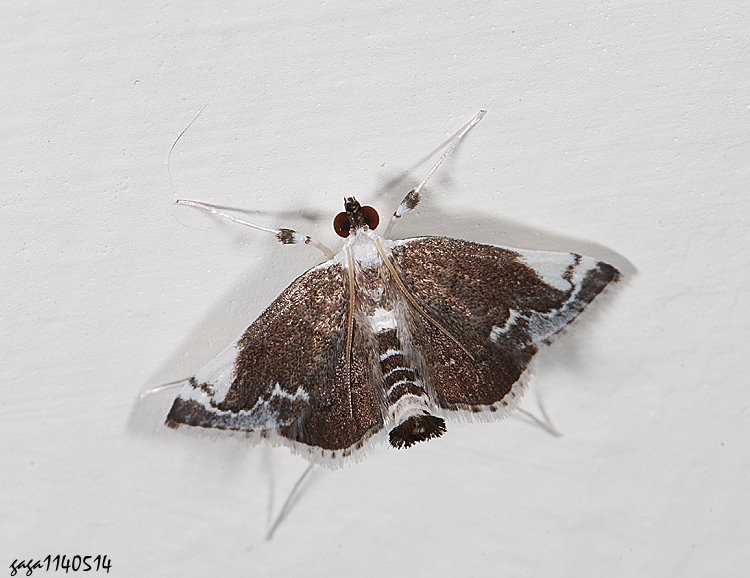 ↑鬚歧野螟屬 Trichophysetis sp., 翅面黑褐色,亞端線為波狀的橫紋,近頂角具白色分布,緣毛白色,停棲時尾部習慣上舉。