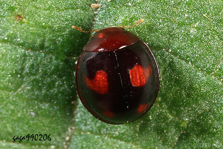 ↑麗艷瓢蟲 (知本) (瓢蟲科 / 艷瓢蟲屬)體長2.4-2.7mm,前胸背板紅褐色,翅鞘黑褐色,光滑,左右各有2枚紅斑,上斑較大,橫向,外側較窄,下斑位於翅端附近,較小。 本屬8種,分類於艷瓢蟲屬,本種分布於低、中海拔山區,成蟲具趨光性。