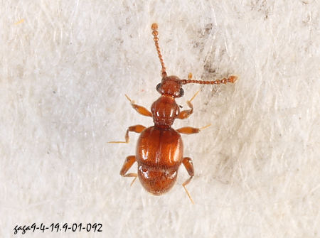 (隱翅蟲科 / 蟻塚蟲亞科)體長1.7mm,外觀近似的種類,本圖體型較小,體背具微弱的光澤,觸角黃褐色,節間細毛不明顯,脛節以下黃褐色。