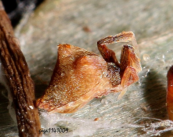 ↑蓬萊蟱蛛(雌),停棲時第1-2步足合併向前伸,第3-4步足貼腹側,模仿樹枝狀。(體長6mm)
