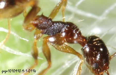 ↑印度大頭家蟻,工蟻,同第一圖,前胸背板較光滑,中胸背板後緣左右各有一枚小短刺。 (甘露寺) 2mm