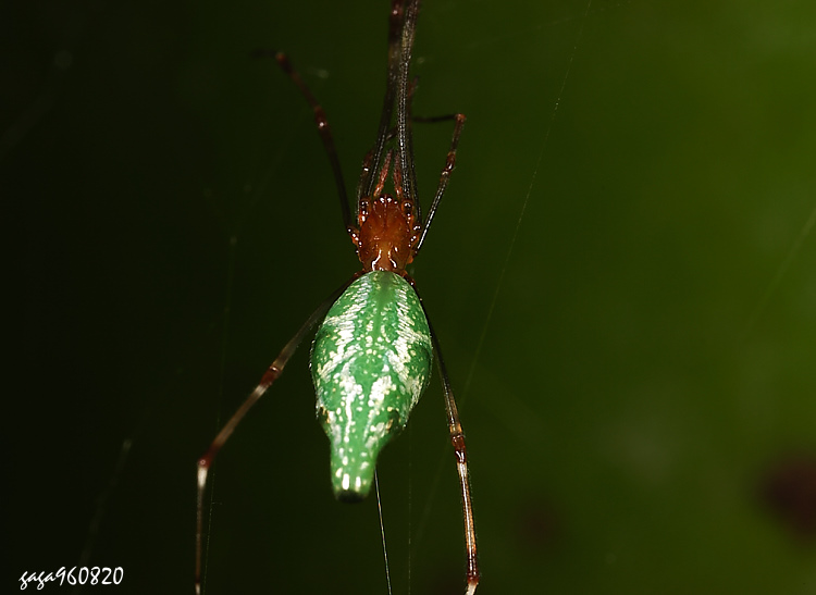 (姬蛛科 / 銀斑蛛屬) 體長9mm,外觀近似裂額寄居姬蛛或熊本寄居姬蛛,但本種雌蛛腹部綠色具白色斑紋,雄蛛體型瘦長。雌、雄發現在同一個網上。