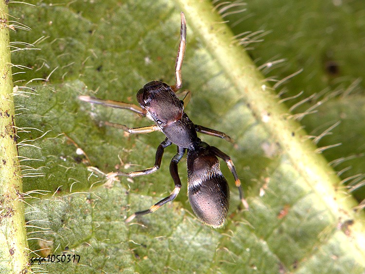 ↑黑色蟻蛛 (雌) (蠅虎科 / 蟻蛛屬) 體長5-11.5mm,雌蟲體色黑色,型態像螞蟻,頭胸寬大於腹部,眼域四周黑色或黑褐色多毛,胸背板褐色,頭胸間有明顯的分隔,頭後下側白色,腹背灰白色,中央有一條黑色的環帶。 雄蟲一般黑色,大顎發達,腹部長,前半具縮隘,雄蛛體型及斑紋變異很大,體色從黑色到褐色 。 本屬9種,本種紀錄於低海拔300-1000公尺山區,常見棲身低矮的樹林或草叢,欄杆、牆角爬行,也會在葉面織薄絲為巢棲息,普遍。
