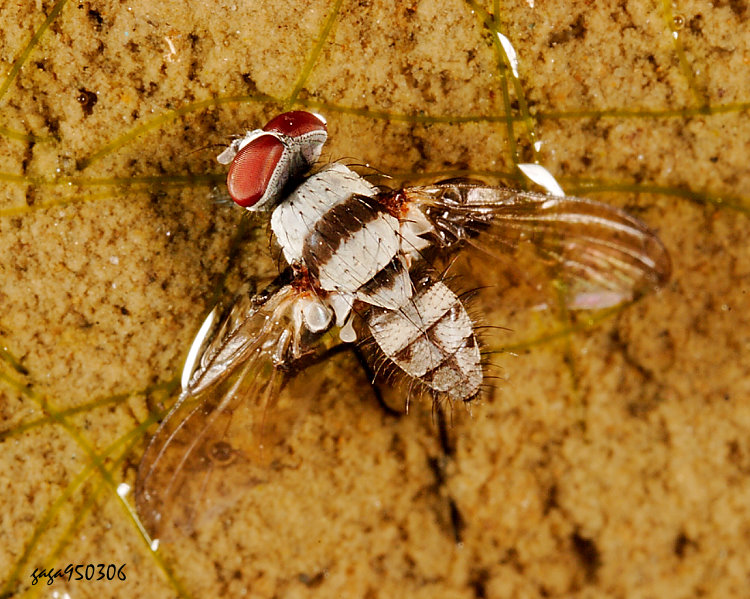 ↑橫帶花蠅 (雌) / 200-350 公尺 (花蠅科 /花蠅屬) 體長 6mm,體背灰白色,複眼紅色,觸角附枝具纖毛,胸部背板有2條黑色的橫帶,腹背各節具黑色橫帶,末3節具黑色中線,翅膀透明。 本屬2種,本種紀錄於平地至低海拔山區,常見於公園、學校、馬路的行道樹,喜歡棲息光亮的木板或樹幹,少數個體夜晚會趨光,習性靈敏,飛行迅速不容易靠近。
