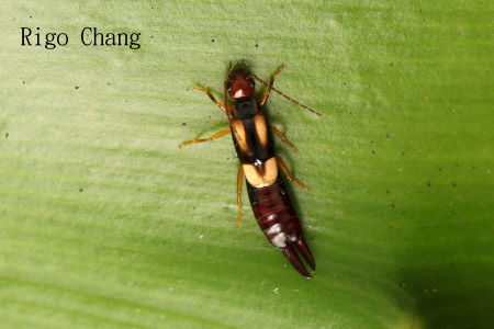 Rigo Chang (蠼螋科/蠼螋屬) 小型,頭部褐色,觸角褐色,前胸背板扁平,黑色,邊緣灰白色,前翅黑色,中央有一條黃色的縱斑不達翅端,後翅中央的鱗狀區黃色,腹部黑褐色,尾夾短,各腳黃褐色。 本屬3種,本種分布於低海拔山區,少見。