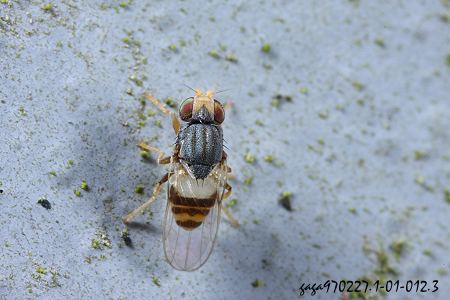 ↑異形稈蠅 ,胸背板灰藍色具3條黑色縱紋,腹背面前半白色,後半褐色有2條一寬 一窄的黃色橫帶。 (土城)