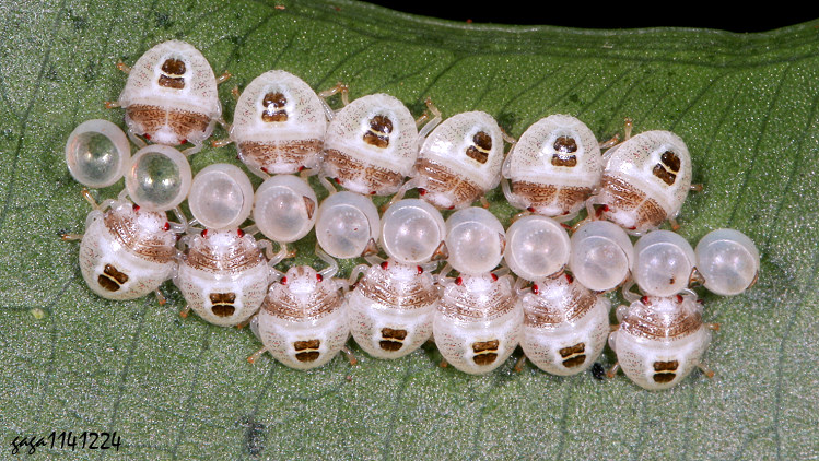 本種紀錄於低海拔450-500公尺山區,發現於葉片下方,剛孵化的若蟲,11粒卵,卻孵化出14隻,非常可愛。