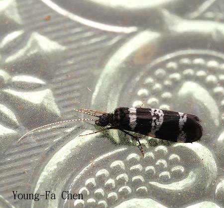 ↑白條腺紋石蛾,前翅黑色有3條白色橫帶,各腳黑色。 攝影:Young-Fa