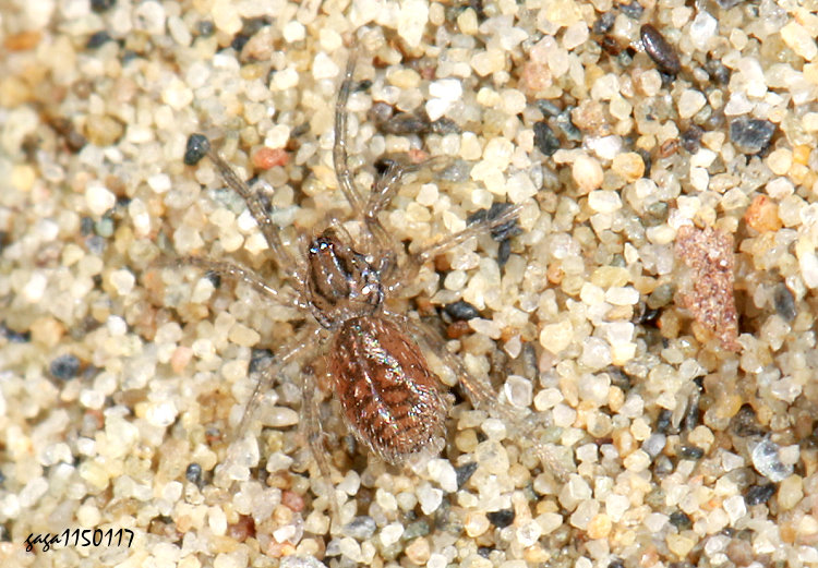 ↑新安蛛屬 Neoantistea sp. (橫疣蛛科) 體長2mm,體色淡褐色,頭胸部寬大或等於腹部,中窩具向外放射狀黑色條紋,腹部顏色較深,左右各有八字型淡色斑紋排列,各腳粗大,透明。
