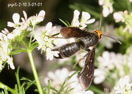 ↑土蜂屬 Scolia sp.,頭部橙黃色,體背黑色,觸角黑色,腹部前節具短柄。 (水上鄉)