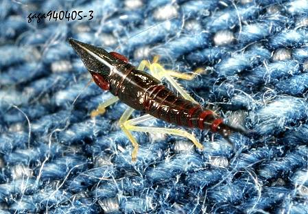 ↑葉蟬科 (若蟲),體型瘦長,體背黑色具光澤,頭部前端口吻尖長,複眼褐色,各腳脛節端部以下黃白色,脛節內側具排刺,分布於1000公尺左右山區,不普遍。(體長2.9mm)