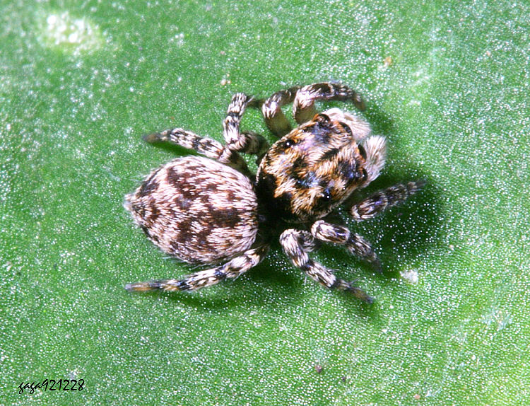 ↑華斑蛛屬 Chinophrys sp. (雌) (體長3.5mm) / 1200-1800公尺 (蠅虎科 / 躍蛛屬) 雌蛛體長3.5mm,體背淡灰褐色,體型寬胖,頭胸背板略方型,腹部卵型,中央寬廣,末端收窄,腹背中央有一條黑褐色寬型的橫向斑紋,下緣有2枚不明顯的白色圓斑,腹端上緣有3條不明顯的黑褐色橫紋,各腳粗短,腿節端部有白色的環帶。 本種紀錄於低中海拔800-1800公尺山區,稀少。 本屬2種,為