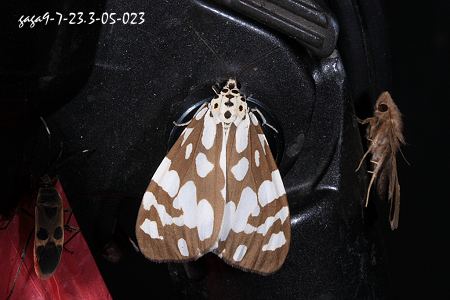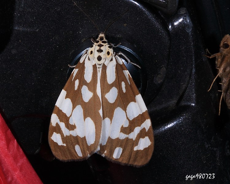 ↑大花斑蝶星燈蛾 (燈蛾科 / 燈蛾亞科) 展翅47-50mm,前翅暗褐色,翅面近基部有一條白色縱帶,下端有一枚斜狀的白斑,前緣中央至臀角區有一條白色斜帶,帶型由4枚相連或分離的白色斑構成,其下緣或附近有大小不一的白色斑分布,後翅白色,近外緣有暗褐色分布。 本屬4種,本種舊稱大花斑蝶燈蛾,其中一種為小花斑蝶燈蛾,翅面的白斑較窄,前翅中室附近僅有一條白色斜帶,本種為2-3條,斑型較密集多變。 本種紀錄於低海拔山區,數量較小花斑蝶燈蛾少。 同物異名: Pitasila brylancik
