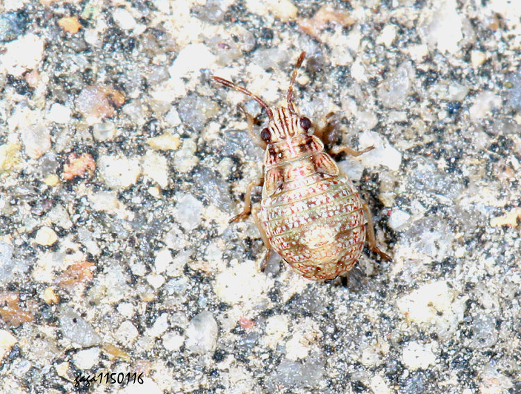 ↑背孔長椿亞科 Nithecus sp. / 20-80公尺 (長椿科 ) 體長4.5-5mm,體型長橢圓型,短翅,腹部寬扁,具橫向的條紋,中央有一條不明顯的縱紋,後方有2-3枚黑斑。 若蟲型態近似Nithecus jacobaeae,該種廣泛分布於歐洲,亞洲少有紀錄,一般短翅,也有長翅型。 本屬目前名錄沒有,紀錄於海邊至平地,地棲性,善於爬行,具刺吸式口器,觀察棲息環境,可能以某種草叢類植物的或吸食植物汁液為食,群聚性,稀少。 (附記) 本種型態也很像Elasmolomus屬的若蟲,需要再鑑定。