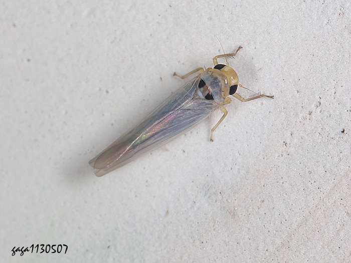 ↑小葉蟬亞科Typhlocybinae / 3 mm (葉蟬科) 體長3-3.6mm,體背淡黃褐色,頭部寬窄,複眼大,黑色,前胸背板具不明顯的紫色或黃色分布,小楯版基部有2枚黑色的大斑,與前方的複眼相呼應,斑型極富趣味,翅膀透明,隱約可見腹面紫藍色的斑紋,各腳淡色無斑。 本種體型很小,分布於1000公尺左右山區,夜晚會趨光。