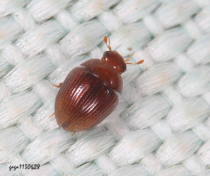 (牙蟲科) 體長1.8-2.1mm,體型卵形,體背紅褐色或暗褐色,觸角短,端部3節膨大呈錐狀,下顎鬚線狀細長,前胸背板中央隆突具刻點,翅鞘有不明顯的縱向溝槽,內有刻點排列,各腳短,後腳脛節端部密生短刺,跗節多節細長。