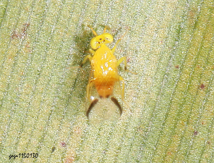 ↑古蚜小蜂 Aphelinus ancer / 200-250公尺 (蚜小蜂科) 體長2.3-2.5mm,體色黃色,複眼黃色,有3枚小眼,頭部橫向,觸角粗,前胸背板有多條不明顯的毛斑,翅膀透明,近端部有一條斜向的黑色條紋,腹部有3條橫紋,各腳淡黃色。 本屬4種,本種紀錄於低中海拔250-1000公尺山區,目前發現2筆,有些個體會趨光,稀少。 本屬已知物種,為