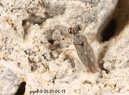 ↑細腳椿象 Valleriola sp. (大雪山) (細椿科) 體長3.5mm,頭部及複眼寬大,複眼暗褐紫色具微弱的光澤,觸角細長,4節,第一節最短,其餘各節都很長,頭胸間具窄頸,前胸背板灰土色具刻點,下緣不具側角,小盾板黑褐色,都部有淡黃色斑,革質翅土灰色有3枚淡黃色斑,位於後緣的黃斑最明顯,膜質翅灰褐色略透明,脈紋發達,各腳淡黃褐色無斑,後腳最長。 本種外觀像虎甲蟲,但前胸背板前窄後寬,虎甲蟲前胸背板長筒狀並具金屬光澤。 本種分布於1000公尺左右山區,棲息乾燥的岩壁,體型很小,若有騷擾就躲藏到隙縫或洞穴裡,保護色良好,稀少。