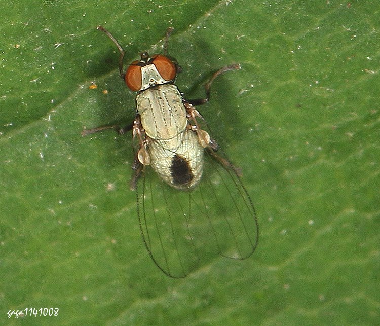 (鱉蠅蠅) 體長2.6mm,體色白色,身體略長,胸背板側緣灰色,中央具3條黑色斑點,縱向,腹部中央有一條黑色粗獷的縱斑。