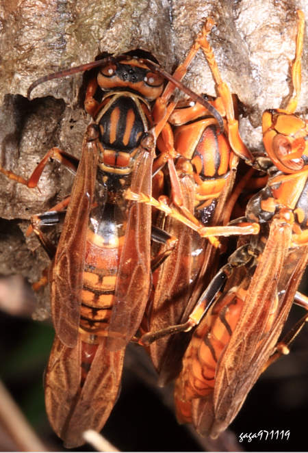 ↑暗黃長腳蜂 (家長腳蜂),護巢。