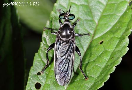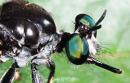 ↑蟹形食蟲虻屬 Maira sp. (食蟲虻科 /蟹形食蟲虻屬 ) 體長14.5mm,體背及各腳黑色具藍色光澤,胸被板左右具橫向的刻紋,複眼具藍、橙色的七彩光斑,色彩鮮艷。 本屬2種,本種紀錄低中海拔山區,曾於北部山區見過多次,最高在1240公尺山區,喜歡陰暗的林道或樹蔭下活動,習性靈敏,擅於捕捉小昆蟲,曾見其捕食金花蟲,以尖銳的口吻刺穿胸背板,然後起飛帶到另一個地方享受佳餚。