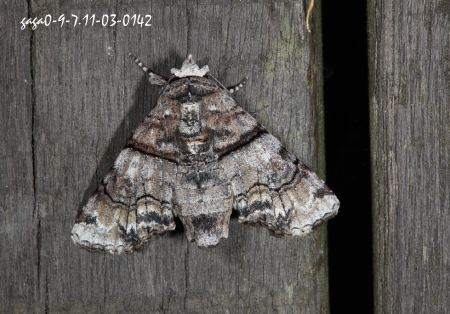↑頂斑仙尾夜蛾 (尾夜蛾科) 展翅39-40mm,前翅淡灰褐色,前胸背板寬廣,翅面中線黑色呈直線狀,外線弧狀,中室上下端各有一枚斑紋,亞端線白色,外緣的脈端上各有半圓狀的斑型排列。 本種分類於Euteliidae 尾夜蛾科\Euteliinae 尾夜蛾亞科,分布於低中海拔山區,幼蟲體色黑色,全身密生黑色瘤狀突,胸部發達呈球狀膨大,腹背前段有一個白色或黃色斑塊,幼蟲已知以楓香、羅氏鹽膚木為食草,幼蟲常見,網路有多人帶回家飼養。
