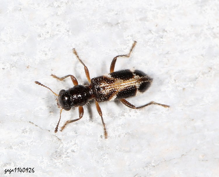 型態描述:小型,體長形,體色黑色,各腳褐色,翅鞘有2對白斑,上斑斜向,下斑橫向。