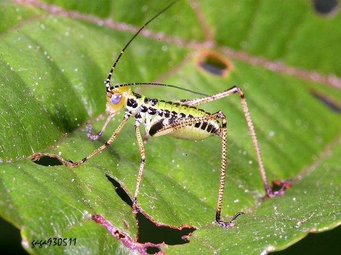 ↑黑角露螽 ,終齡若蟲、雌,體色綠色,各腳細長,脛節以下褐色。(體長16mm)