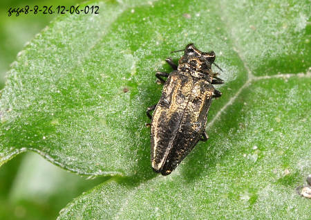 ↑絹豔凹頭吉丁蟲 (大雪山) (吉丁蟲科 /艾古利吉丁蟲屬 ) 體長4.3mm,體背銅黃色具金屬光澤,頭部中央凹陷呈V字型,前胸背板具橫向的瘤突,翅肩寬,前翅前緣一般黑色,後緣近翅端黑色,近基部左右各有2枚不明顯的灰黑色圓斑,翅面凹凸不平猶如銅器肌理。 本屬6種,本種體型短,腹中央較寬,具銅綠色金屬光澤,分布於1000公尺以上山區,少見。