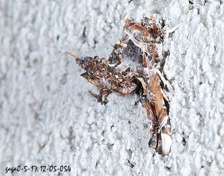 ↑大鹿尾夜蛾 ,成蟲翅型寬大但停棲時前翅會縮摺,尾部上翹,體背的灰白色像蜘蛛的絲線,乍看像一隻被蜘蛛捆綁的蛾。 (合歡山)