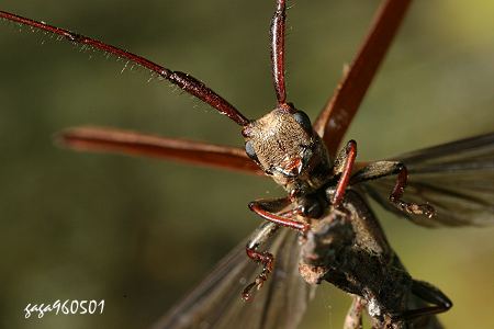 ↑台灣細角瘦天牛 (體長14mm) (天牛科 / 粗天牛亞科)體長13-16mm,體型瘦長,頭部及前胸背板黑色,前胸背板中央有一條不明顯的灰褐色縱紋,翅鞘黑褐色密生刻點,翅面具不明顯的灰褐色縱紋,翅端尖窄,各腳細長黑褐色,腿節粗顏色較深。本屬4種,本種又稱台灣細胴天牛,普遍分布於低中海拔山區,白天在陽光下飛行,姿態優美,停棲時緊貼樹幹,保護色良好。