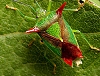 (同椿科) 體長約13mm,頭部至前胸背板前葉綠色,前胸背板後葉紅褐色,兩端側角尖長,紅色,小盾板綠色,端部尖長,前翅革質部分褐色,外緣綠色,膜質翅褐色,雄蟲腹端有一對尾角外突,紅色。