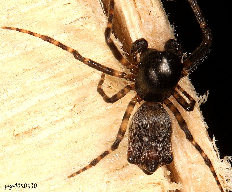 (金蛛科 / 壯頭蛛屬 ) 體長3.6-3.7mm,頭胸部寬圓黑色具光澤,腹部末端截平,中段又2沒白色圓斑,近末端有4枚黑色瘤狀突起,排列3-1,最後端1枚。