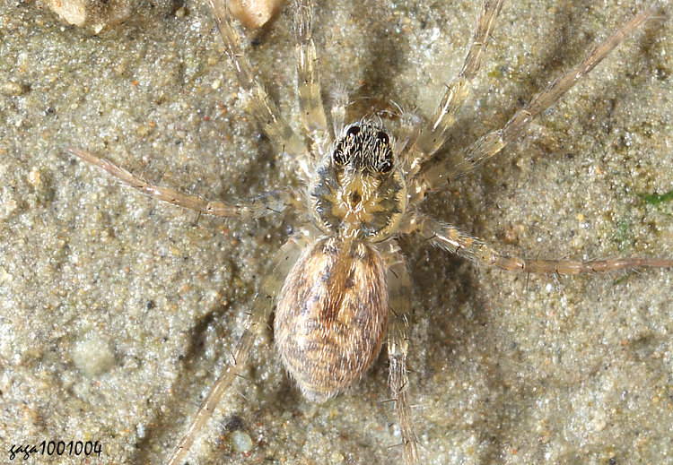 ↑蘇門答臘豹蛛 Pardosa sumatrana / 150-250公尺 (狼蛛科 / 豹蛛屬) 體長5.6-8mm,體背黃褐色,頭胸部眼域區域內黑色,一般中央有明顯的放射紋,有些個體中央具寬型的淡色縱帶,腹部兩側有不明顯的對稱黑斑和黃斑,4-6枚,各腳密生黑色斑,狀如黑豹。斑型變異大,有些會隨環境改變顏色,同一環境下的斑型也會不同。 網路;Pardosa sumatrana 廣泛分布於印度和亞洲,但台灣名錄目前沒有這個學名。 本屬6種,本種紀錄於海邊、平地沙地至低海拔100-200公尺山區,常見棲息沙地、河床、草叢、枯葉及人工建物下,數量相當多,遇到騷擾成群的個體到處爬竄,群聚性。