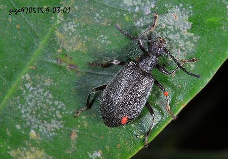 ↑灰黑異角擬金花蟲 (觀霧) (步行蟲科 / 擬金花蟲亞科) 體長11.5mm,通體黑色,有些個體褐色,翅面具不明顯的灰白色短毛,觸角基部膨大,7、8、10節端部尖突,末節最長。 本屬7種,分類於異角擬金花蟲屬,本種分布於低、中海拔山區,2-5月可見。