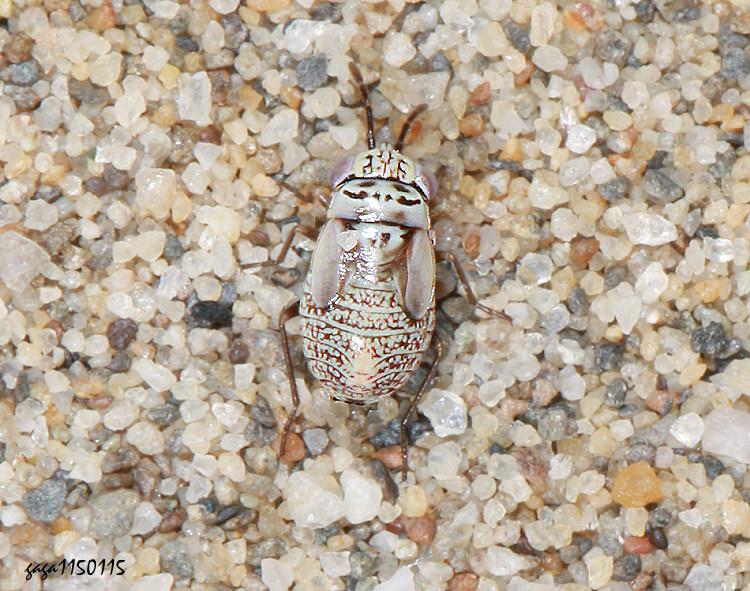 ↑大眼長椿屬 Geocoris sp. (若蟲) (長椿科) 型態描述: 本屬皆小型,若蟲體長約 2 - 2.2mm,體型寬廣,體色白色,頭部及胸背板具黑色斑紋,觸角4節,黑色,腹部具排列整齊鑲褐色邊的白斑。 成蟲不明,若蟲近似Geocoris pallens,該種主要分布於北美,少數於非洲有紀錄。成蟲胸背板白色,若蟲也是白色,相較於台灣已知的種類,成蟲、若蟲一般都是黑色。 本種紀錄於海邊環境,附近有不少大眼長椿象 Geocoris pallidipennis ,Geocoris pallidipennis 的若蟲肌理和顏色都不一樣,應該是不同的種類。