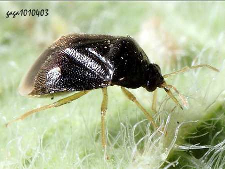 ↑圓花椿屬 Bilia sp. ,體長僅1.8mm,體背黑色,體型寬而略扁,觸角及各腳黃褐色。