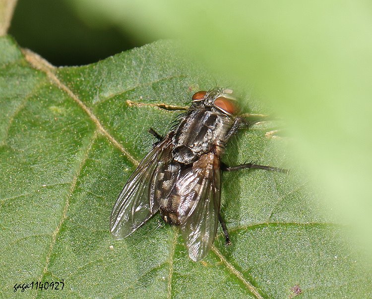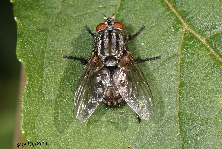 (肉蠅科 / 肉蠅屬) 中小型,複眼紅色,中胸背板灰白色上有3條黑色縱帶,腹部白色,具黑色方塊黑斑,平均散置,翅膀透明,各腳黑色。