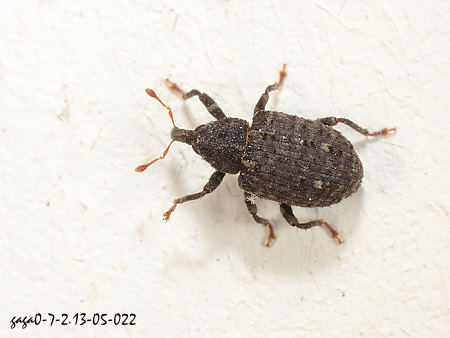 ↑隱喙象亞科 cf. Shirahoshizo sp. (已鑑定) / 5mm (象鼻蟲科 / Cryptorhynchinae亞科)體長4.5 - 5mm,體色黑褐色,前胸背板密布刻點,翅鞘黑色細窄的縱紋,近翅基及近翅末端左右各有一枚灰白色的斑點,翅鞘前緣具稀疏的短毛。體表具粗糙的肌理,有不明顯的刺突和小型的瘤狀突,腹部很寬。 本種紀錄於低海拔至1000公尺山區,夜晚會趨光,不普遍。 本屬1種,為 Shirahoshizo flavonotatus (Voss, 1937)