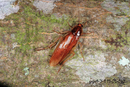 ↑姬蠊屬 Blattella sp. ,體色為鮮豔的紅褐色,前胸背板黑褐色,側緣透明,中央有一條不明顯的縱帶。 (太平山)