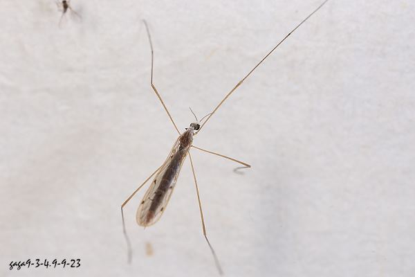 ↑亮大蚊 Rhipidia sp.,雌 (亮大蚊 Rhipidia sp.) 體長6.6mm,體型及翅膀瘦長,中胸背板淡灰褐色,中央有2條黑褐色的縱紋,胸部側緣灰白色,腹背黑褐色,節間具淡褐色環紋,雌蟲具尖細產卵管,褐色,各腳細長淡褐色無斑,翅膀透明,近前緣有2枚細小的黑斑。 本種分布於1000公尺以下山區,不普遍。
