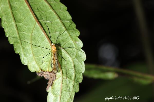 ↑泥大蚊屬 Nephrotoma sp. (宜蘭福山) (大蚊科 / 泥大蚊屬) 小型,體色淡黃褐色,胸背板不具縱紋,與近似種相較,本種翅型較瘦窄,各腳黑色,近基部黃褐色。 本種分布於低海山區,白天停棲葉面,稀少。