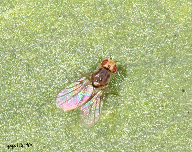 (稈蠅科) 體長3mm,體背淡褐色,中胸背板有3條黑色縱帶,腹部窄,淡褐色,翅膀寬透明。