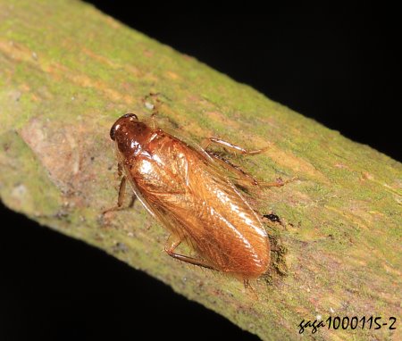↑小蠊屬 Anaplecta sp. (東山鄉) (褶翅蠊科 / 小蠊屬) 體長17-19.5mm,體背紅褐色,額基線兩側下方各有一刻點,暗紅褐色,前胸背板前緣、側緣淺色透明狀,前翅近前緣脈斜向。 本屬1種,本種紀錄於低海拔山區,夜晚出沒,在樹幹爬行,遇到手電筒照射也不會逃離,稀少。