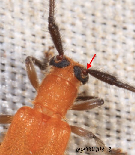 ↑黑角黃天牛,觸角基部著生於複眼位置,以至於複眼不呈圓形或橢圓,而是特殊的腎形。 (嘉義 / 仁和社區)