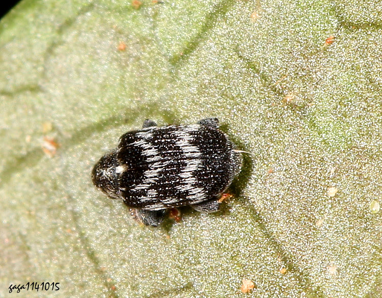 ↑象鼻蟲 Orchestes sp. (象鼻蟲科 / Curculioninae亞科) 體長只有2-2.3mm,體背具絨毛及灰白色的橫向斑紋,2列,弧形,小楯板白色,近翅端黑色。 外觀近似Orchestes rusci,該種廣泛分布於歐洲,亞洲地區沒有紀錄。 本種分布於低海拔700-800公尺山區,少見。 本屬2種,為