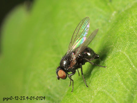 ↑潛蠅,雌,體長約6-7mm,複眼大紅褐色,觸角具芒,剛毛狀,體背黑色,各腳黑色。分類於潛蠅總科、潛蠅科Agromyzidae 。