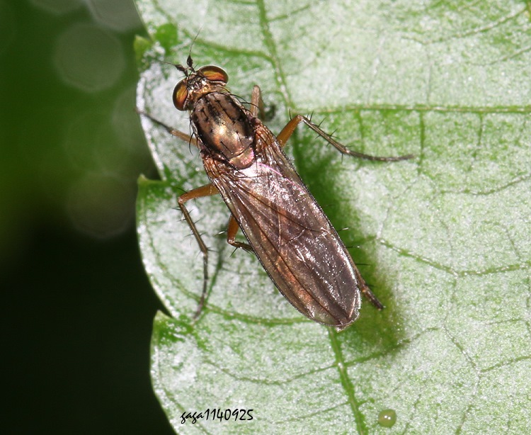 (棉長足虻屬) 體長約6.8mm,體長型,胸背板寬大具銅色金屬光澤,中央有3條黑色縱紋,兩側的縱紋較窄,各腳黃褐色。